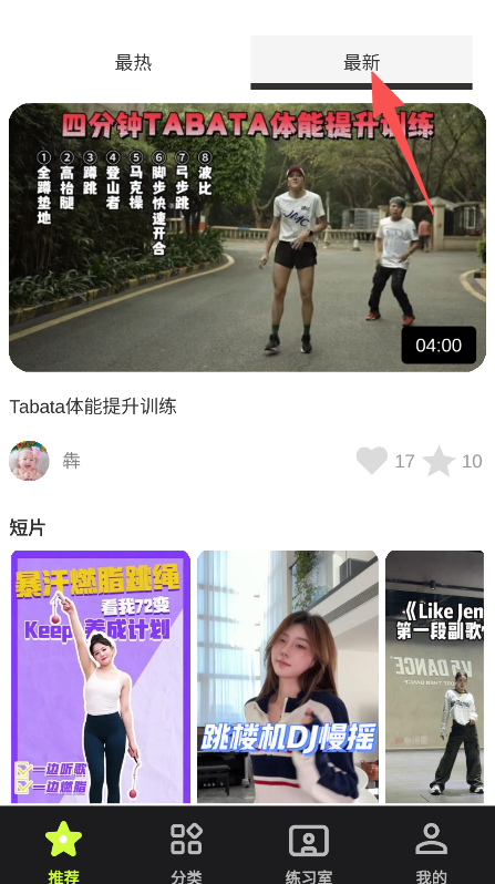 1、设有最热最新内容分类,可切换查看不同更新状态的舞蹈、健身视频,适配不同内容偏好的需求。