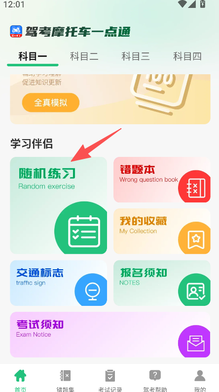 2、在科目板块中,点击学习伴侣里的随机练习选项。