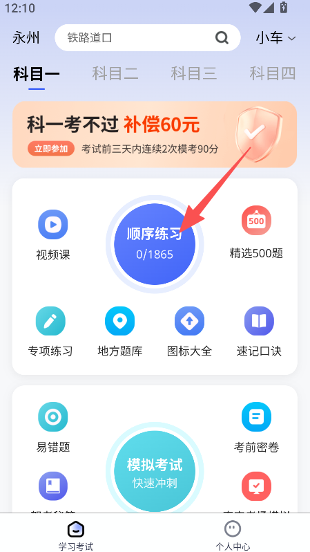 3、配备模拟考试功能,点击快速冲刺,开展科目一的模拟考试练习环节。