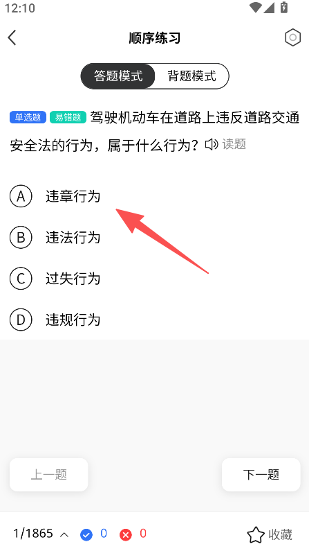 3、在顺序练习答题页面,选择题目对应的选项完成作答。