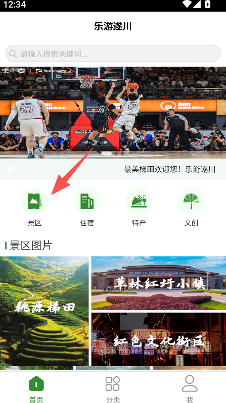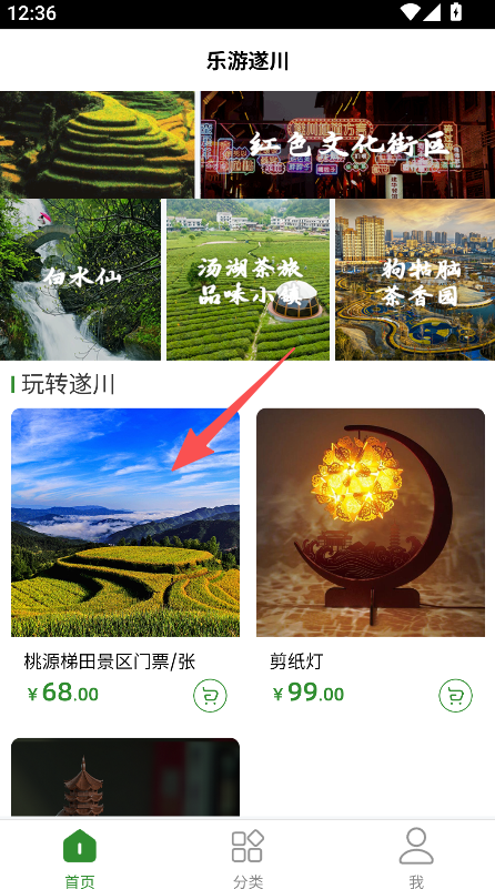 1、提供景区板块入口,点击进入后可查看遂川本地景区相关的图片及对应商品信息。