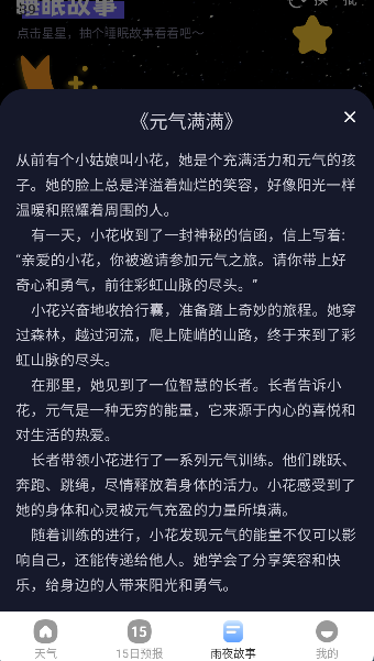 1、 点击雨夜故事,软件瞬间变身一位温润的气象电台主持人,在淅沥的雨声背景音里,为您打开一本泛黄的睡前故事集。