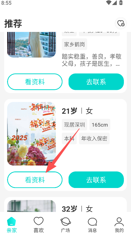 1、打开推荐页面,选择目标相亲对象,点击看资料按钮。