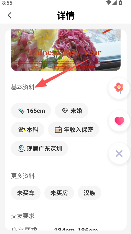 2、详情页整合基本资料、更多资料、交友要求,完整呈现对象信息,辅助了解相亲对象情况。