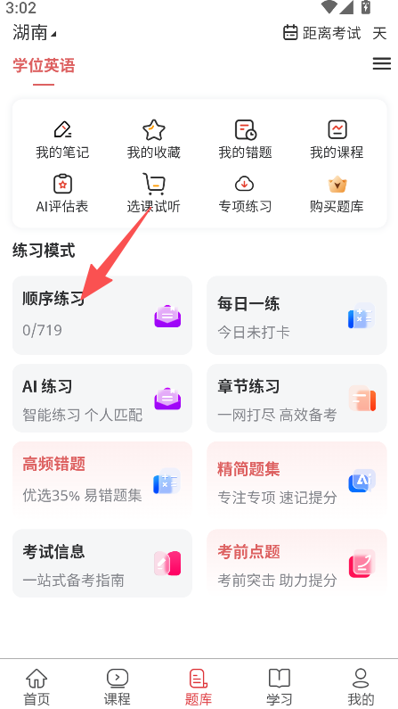 1、打开软件进入题库页面,点击练习模式里的顺序练习。