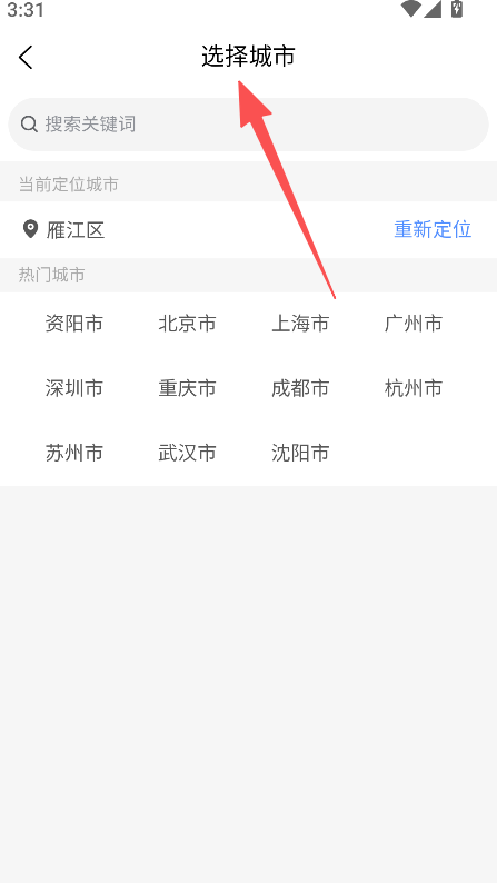 1、打开软件进入选择城市页面,选定对应城市完成区域设置。