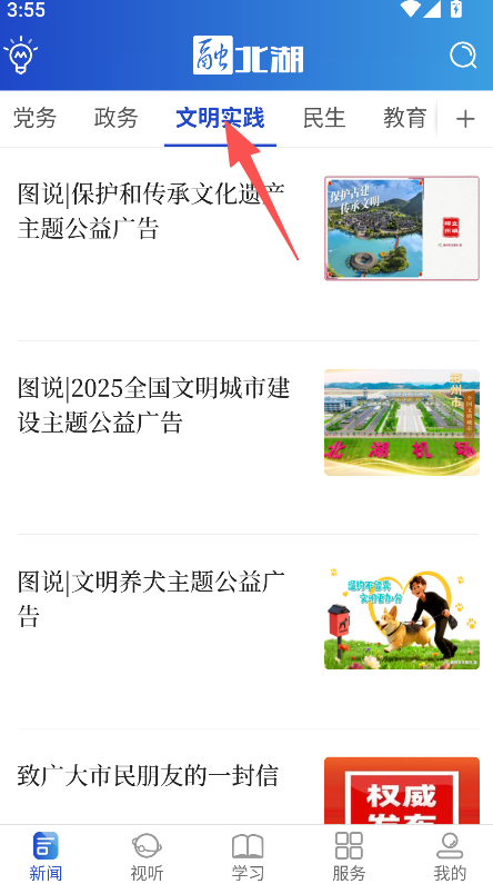 1、打开软件进入首页,点击文明实践板块进入对应页面。