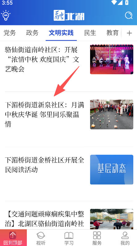 1、具备板块切换功能,进入首页点击文明实践板块,切换至对应类型的本地资讯页面。