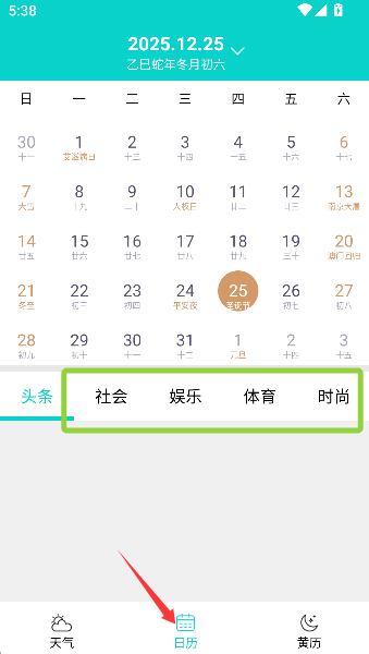 2、点击日历不仅能看日期,还像打开了生活管家的小抽屉,娱乐体育时尚板块像彩色卡片一样弹出来。