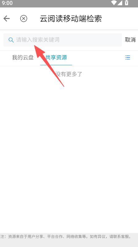1、打开软件进入云阅读移动端检索页面,点击搜索栏输入关键词。
