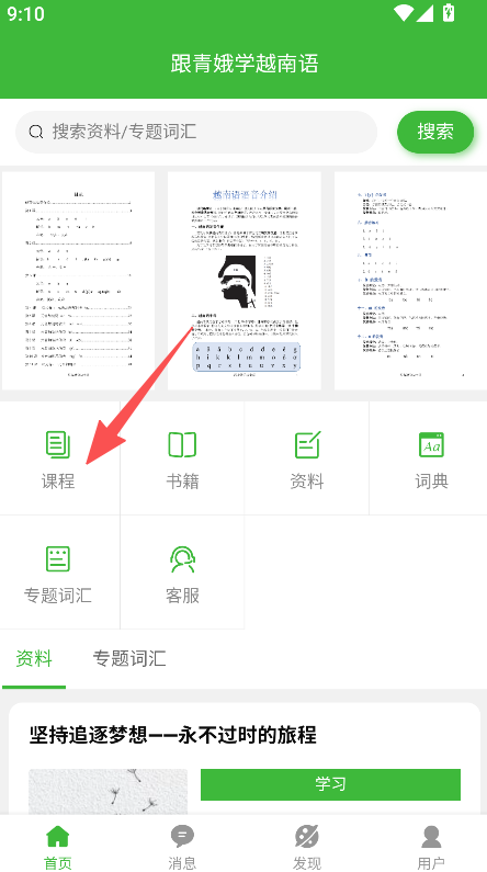 2、整合多类学习功能,含课程书籍资料词典等板块,适配越南语学习的多样资源需求。