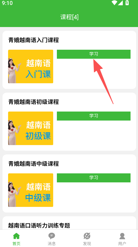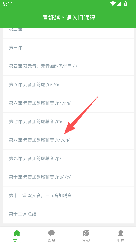 3、提供课程章节查看功能,在课程界面选择对应章节,开始学习该课的越南语知识点。