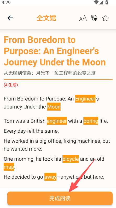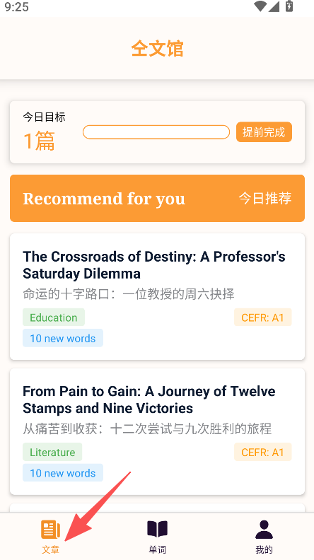 《仝文馆》是一款英语阅读学习软件,设今日目标板块规划阅读任务,提供文章推荐,标注内容分类及语言等级,含新单词学习板块,支持隐藏英文或中文,阅读文章后点击完成阅读,助力英语阅读与词汇积累,适配不同英语水平的学习需求。