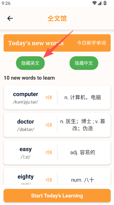 2、支持新单词展示调整功能,进入对应页面点击隐藏英文或中文,切换展示形式。