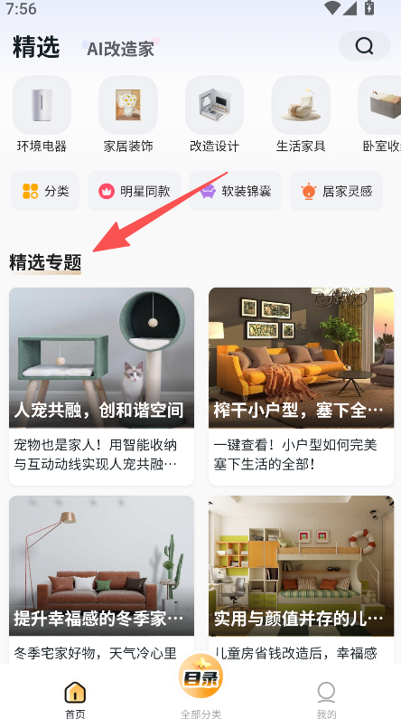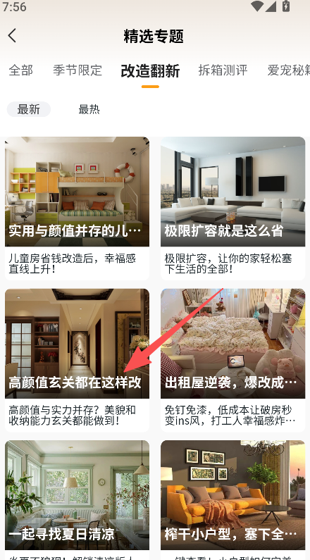 1、具备专题板块选择功能,进入首页点击精选专题,查看家居改造相关的专题内容列表。