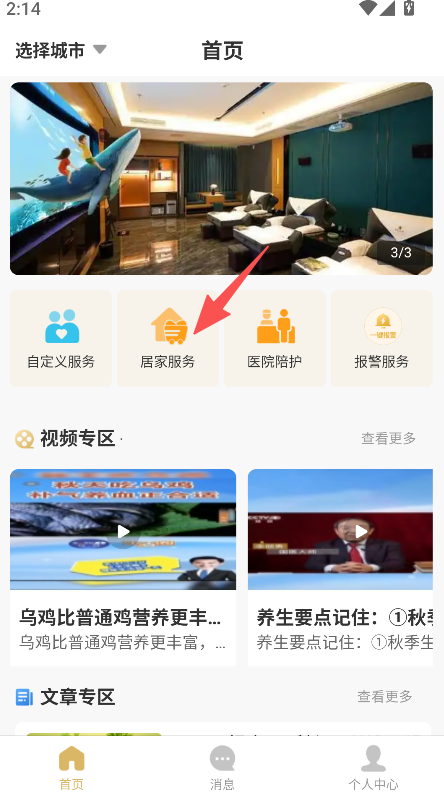 1、打开软件选择目标城市,进入首页点击居家服务选项。