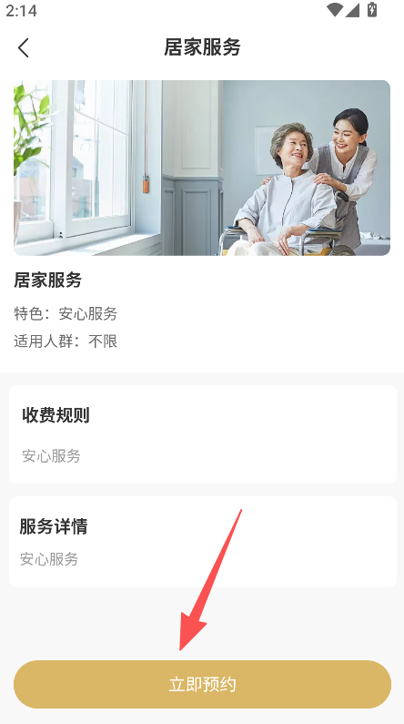 2、居家服务页面简洁展示服务特色及适用人群,可快速了解服务信息,助力预约决策。