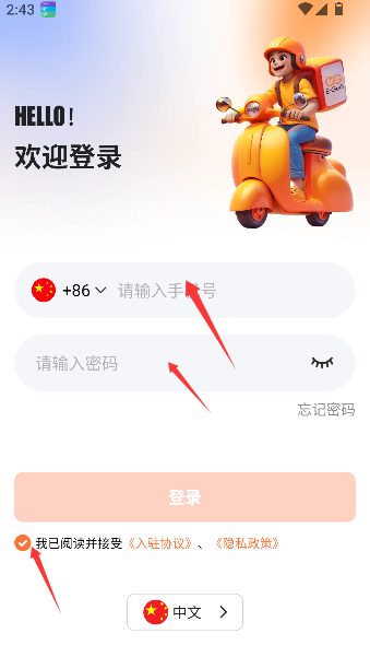 1、输入手机号码,就像在配送大军中报到登记,准备正式踏入接单的繁忙战场。