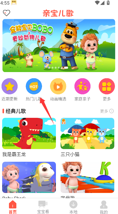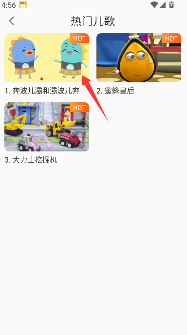 1、在应用主页找到并点击“热门儿歌”入口,即可浏览当前广受欢迎的儿歌合集列表。