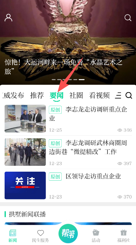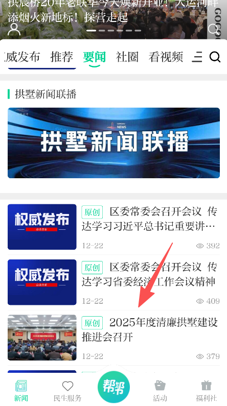 1、提供栏目选择功能,可选择要闻等栏目,进入对应页面查看拱墅本地的资讯内容。