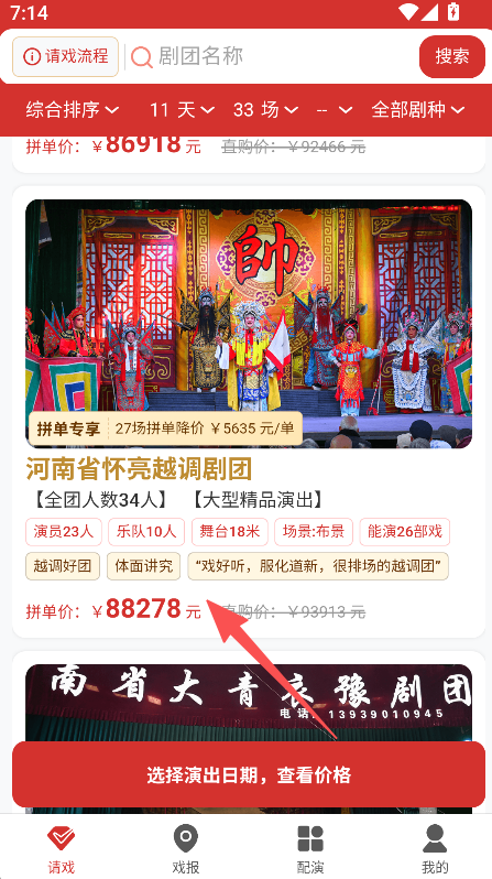 3、提交定戏信息后,查看剧团演出的具体价格及相关信息。