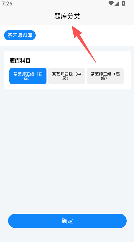 1、打开软件进入题库分类页面,选择目标茶艺师等级并点击确定。