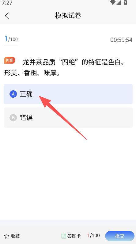 3、进入模拟试卷页面,选择答案完成题目作答。