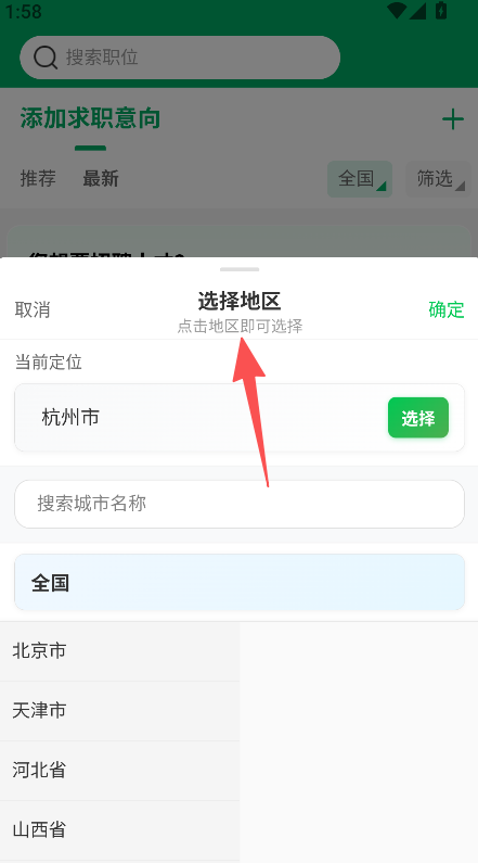 1、具备地区选择功能,进入页面选定目标地区,点击确定完成岗位区域筛选。