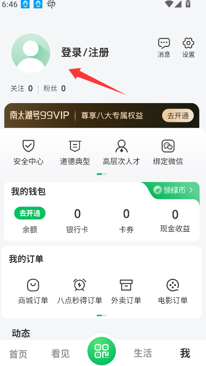 2、在个人中心页面的顶部醒目位置,找到通常标有“登录/注册”字样的按钮或文本入口。