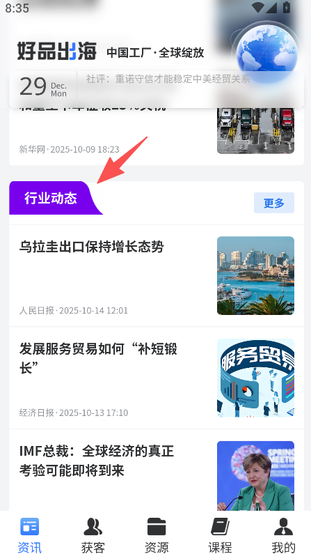 2、支持更多资讯查看功能,在行业动态板块点击更多按钮,加载并浏览更多外贸相关的资讯内容。