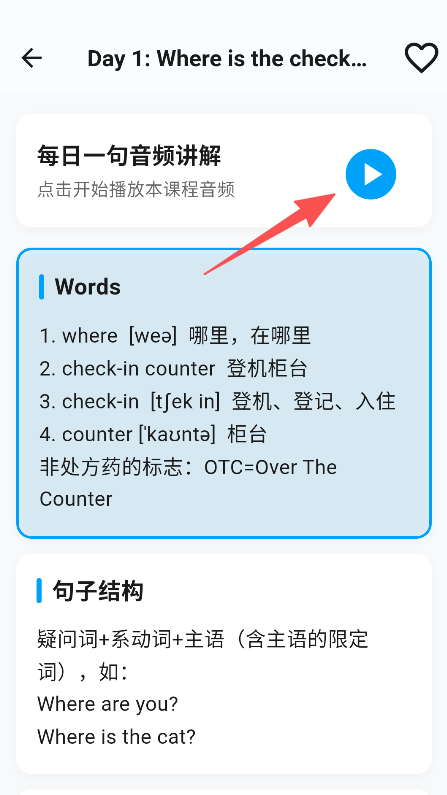 3、具备音频播放功能,在详情页点击播放按钮,收听对应内容的音频讲解,辅助听力与口语练习。