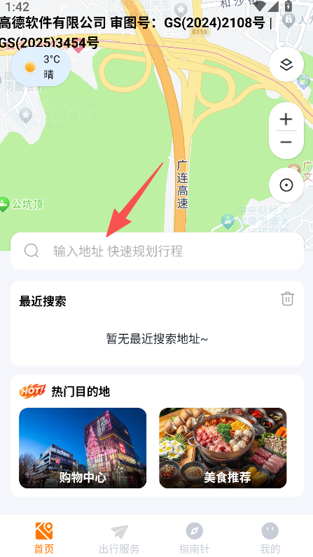 1、设地址搜索栏可快速规划行程,含热门目的地板块,覆盖位置查找与出行规划需求。