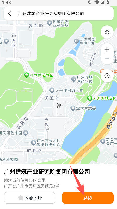 2、在地址详情页,点击路线按钮,查看规划的出行路线。