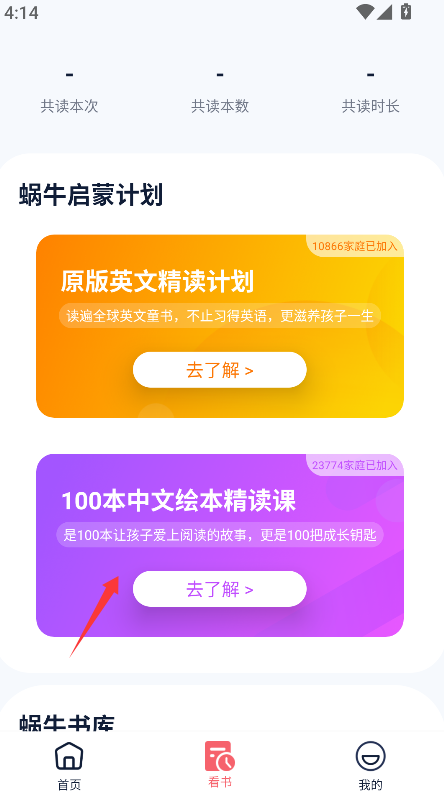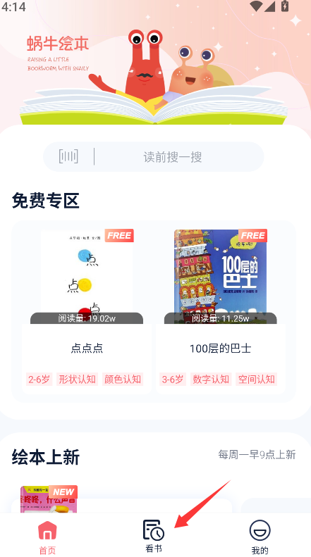 1、找到并点击底部导航栏或页面中央清晰标示的“看书”功能入口。