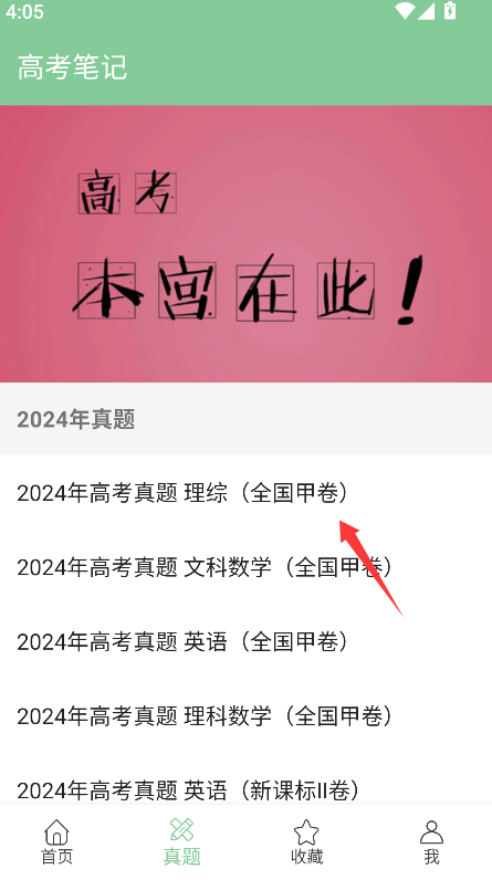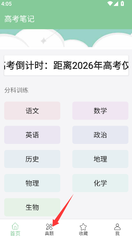1、在应用首页界面底部可找到“真题”功能入口,点击该入口即可进入按科目或年份分类的高考真题列表页面。