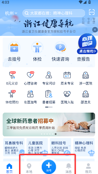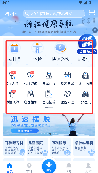 1、首页顶部摆着放大镜和心里面诊预约,像挂了寻医小招牌,想找的科室或医生一搜就有,心里先踏实半截。