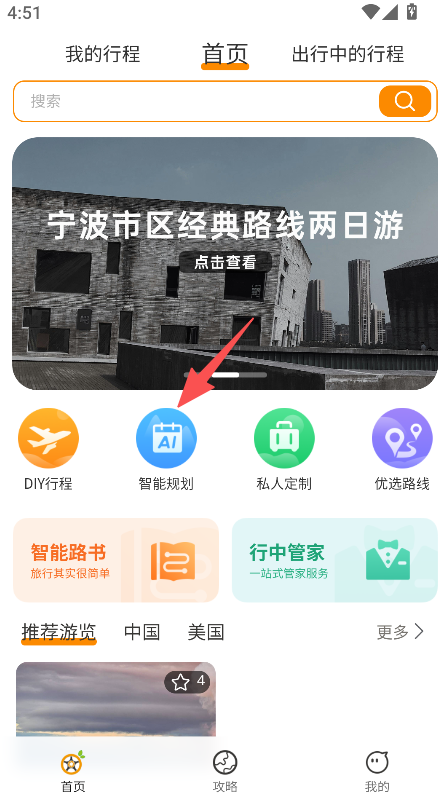 1、提供智能规划功能,进入首页点击该板块,即可进入AI行程页面开始旅行规划流程。