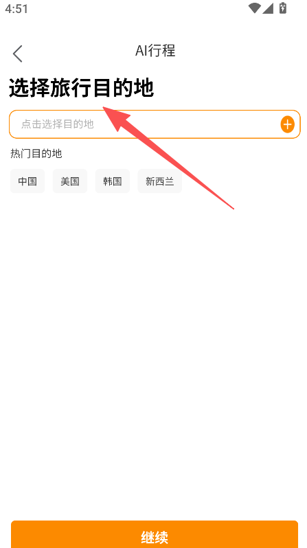 2、在AI行程页面,选择旅行目的地。