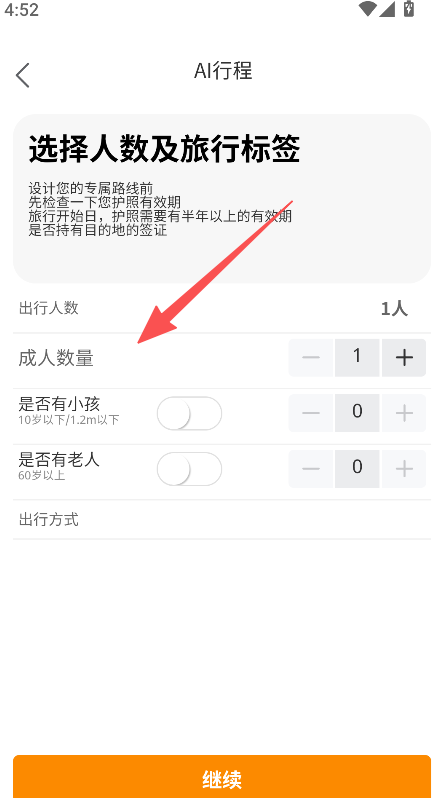 3、选择出行人数及旅行标签,点击继续推进规划。