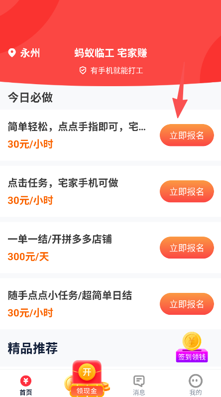 1、设今日必做等任务板块,展示不同兼职任务及对应报酬,适配宅家兼职的任务对接需求。