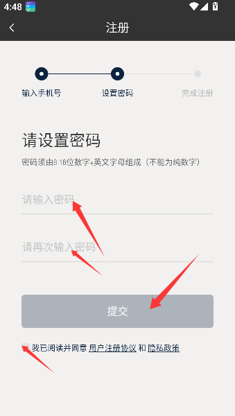 3、设置密码,勾选隐私政策,点击提交,等于为座驾锁配密钥,守好彼此往来的稳妥与私密印记。