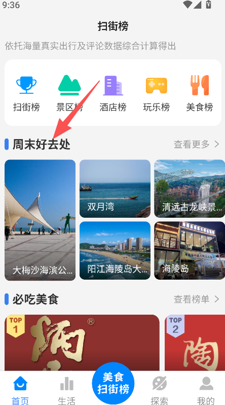 1、打开进入扫街榜页面,找到周末好去处板块。