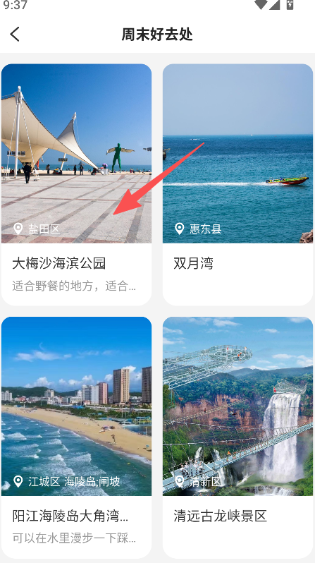 2、点击周末好去处中的具体地点,进入该地点的详情页面。