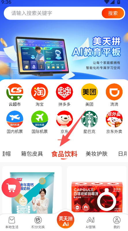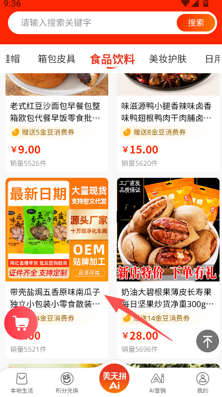 1、打开点击对应品类(如食品饮料)进入商品列表页。