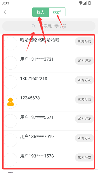 3、找人或找群,输手机号搜一搜,像用雷达锁定目标。