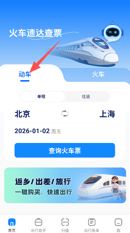 1、打开软件进入首页,选择动车选项,设置出发地和目的地。