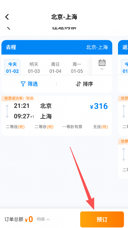 3、选择目标车次,点击预订按钮,完成票务预订操作。
