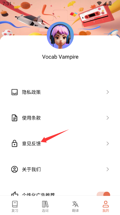 2、找到并点击“意见反馈”这一选项,即可进入专门用于收集建议的反馈填写页面。