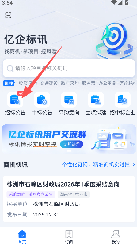 《亿企标讯》是一款聚焦标讯服务的软件,主打找商机拿项目控风险,设搜索栏可输关键词查项目,分招标公告、中标公告等板块,展示商机快讯及采购意向,还能查看中标详情含金额、单位等信息,辅助把握项目相关动态。