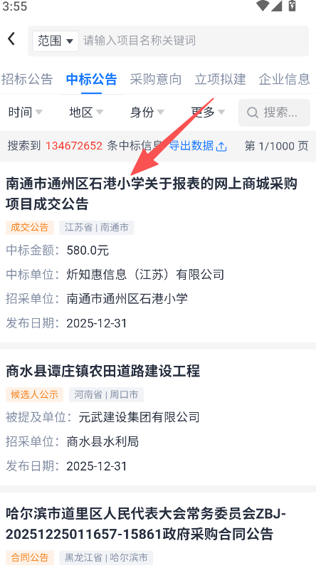 3、支持查看中标详情,包含金额、单位、日期等内容,呈现项目的具体信息情况。